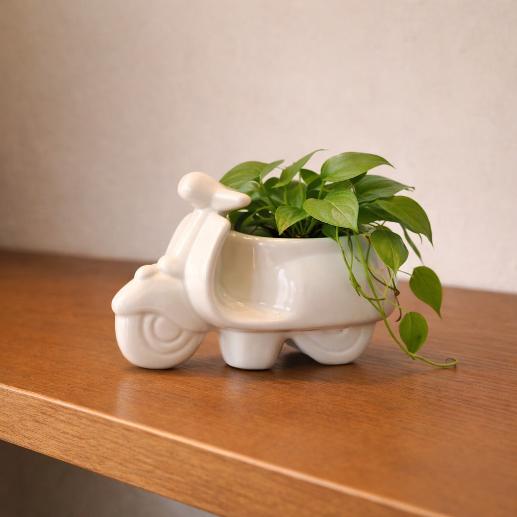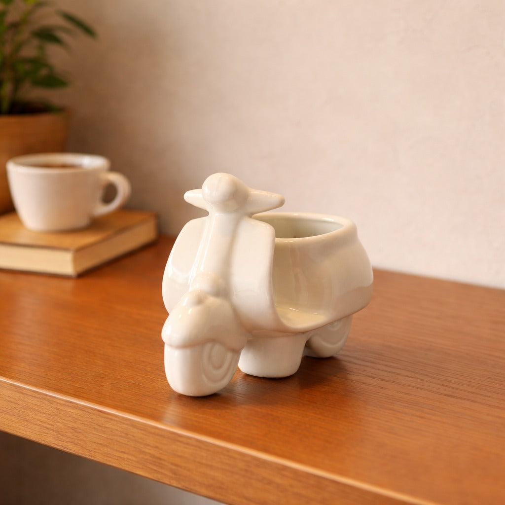 A creative ceramic planter designed as a classic scooter with a small planting cup integrated into the seat area. The glossy white finish and playful structure make it both decorative and functional.