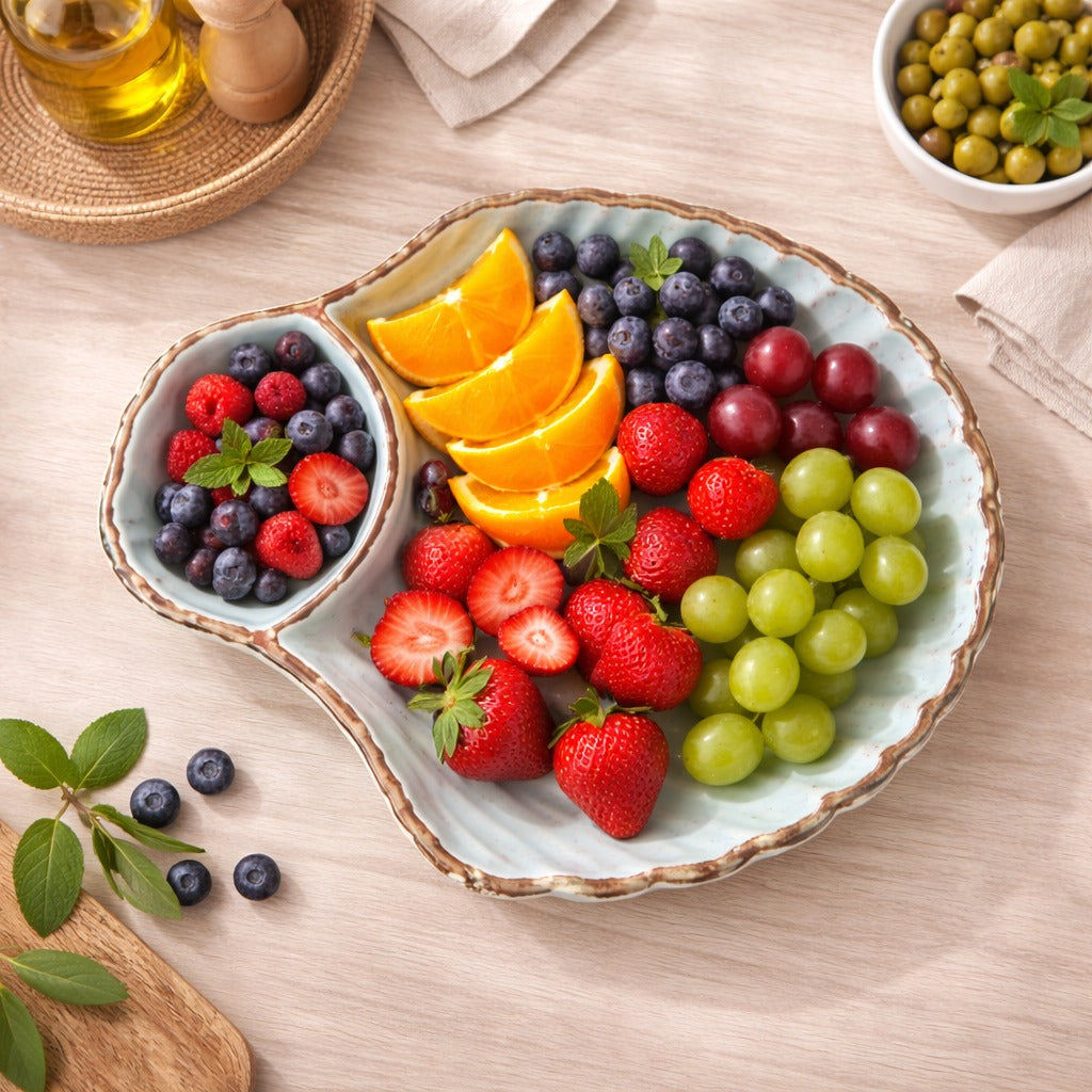 A ceramic platter shaped like a stylized leaf with flowing ridged detailing. Finished in a soft aqua glaze with subtle tonal movement. The organic form adds sculptural elegance.