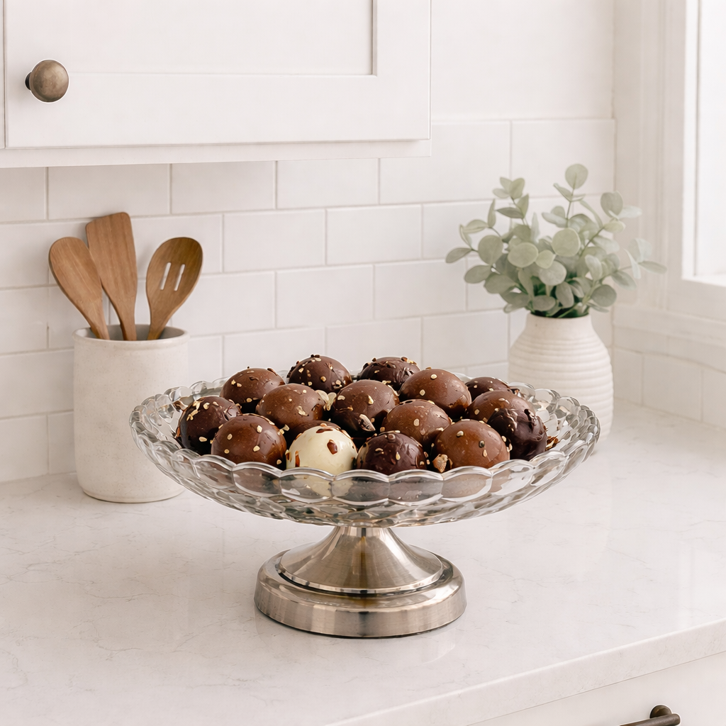 A crystal bowl with sharply faceted edges and a wide open form, elevated on a polished metal footed base. Designed to catch light and add elegance to table settings.