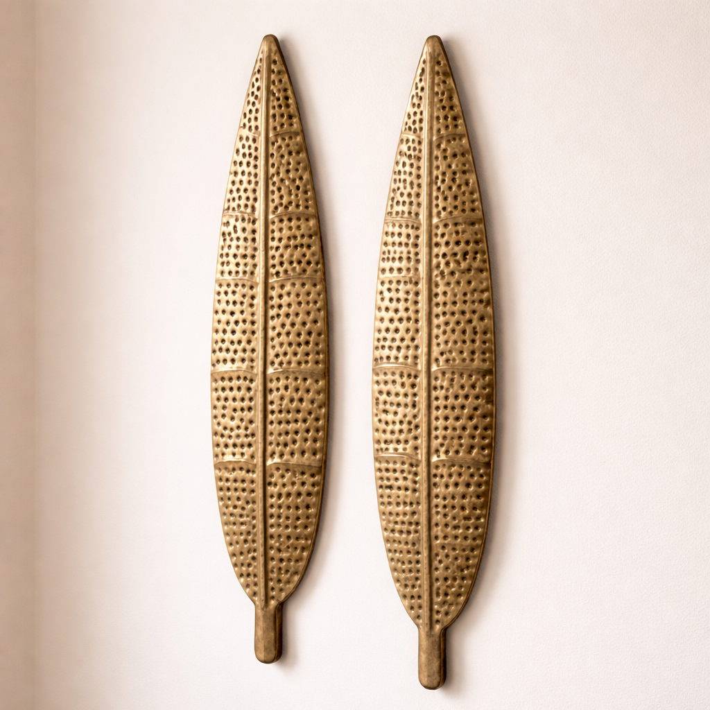 An elegant pair of metal leaf accents crafted with fine textured detailing and finished in a warm gold tone. The elongated form and intricate surface pattern bring a refined, nature-inspired charm that adds depth and sophistication to any interior space.