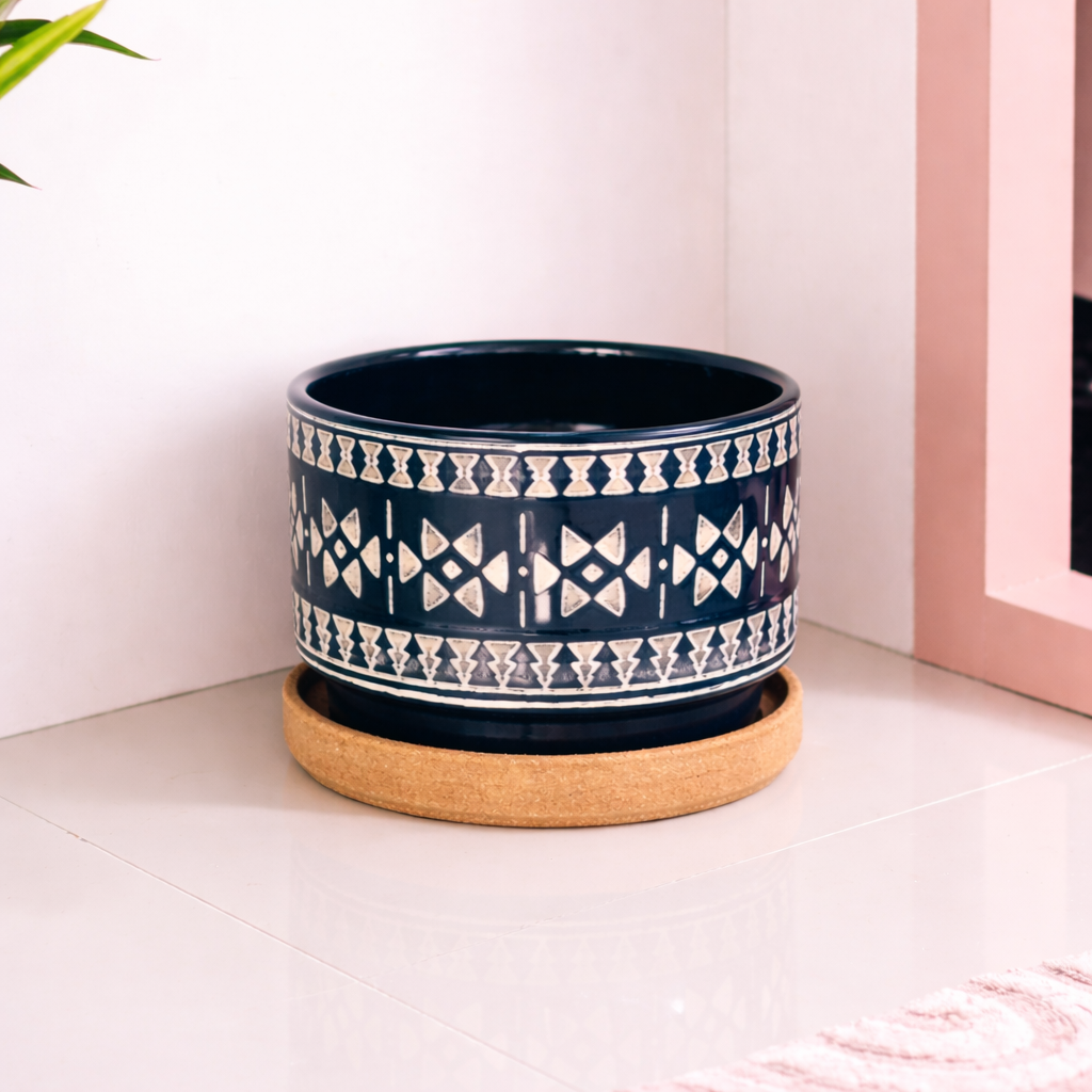 A handcrafted ceramic planter finished in a deep charcoal-blue glaze, detailed with elegant tribal geometric motifs in soft ivory. The cylindrical form is complemented by a natural cork base that adds warmth, stability, and surface protection. Designed to blend modern minimalism with ethnic artistry, this planter makes a refined statement in any indoor setting.