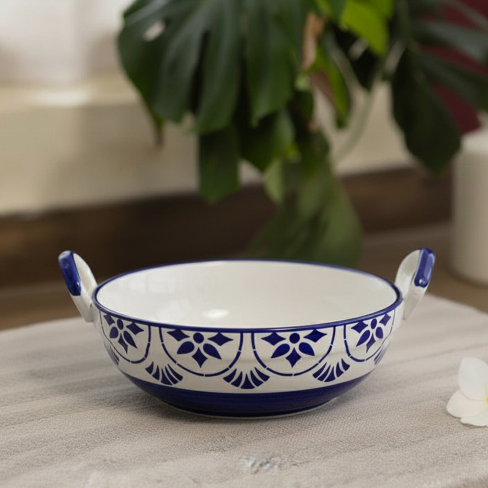 Serving bowls designed with delicate blue floral detailing and sturdy side handles. Showcasing a subtle elegance and warmth to your dining experience.