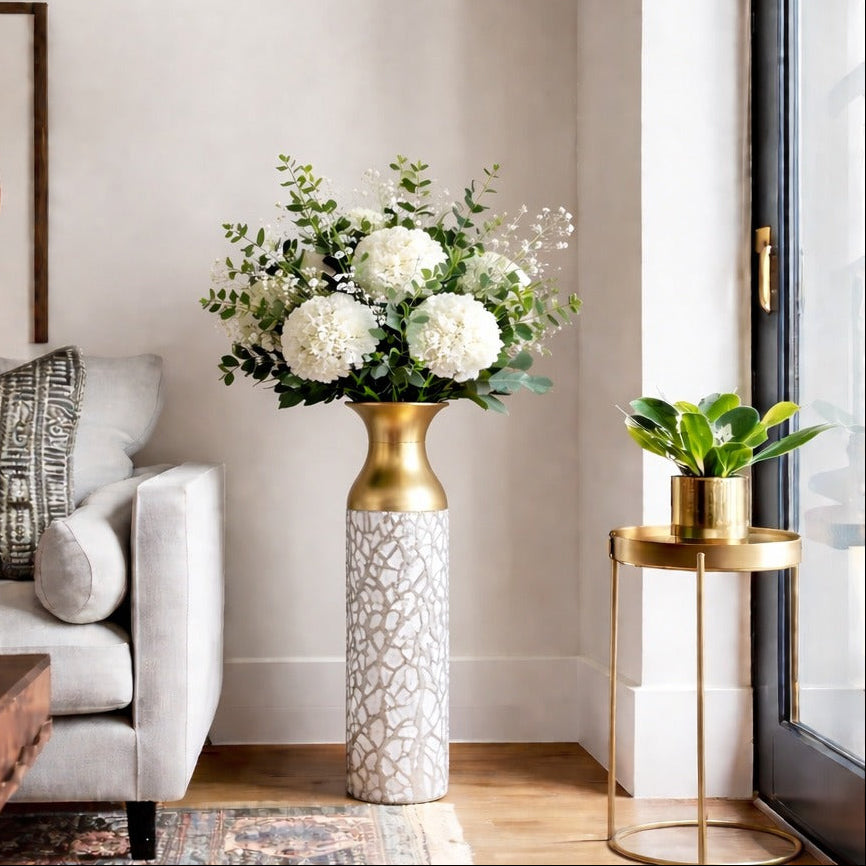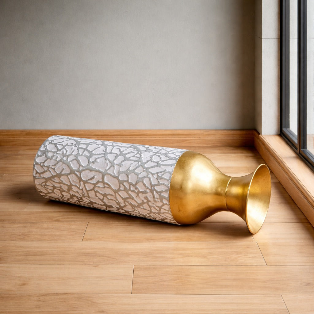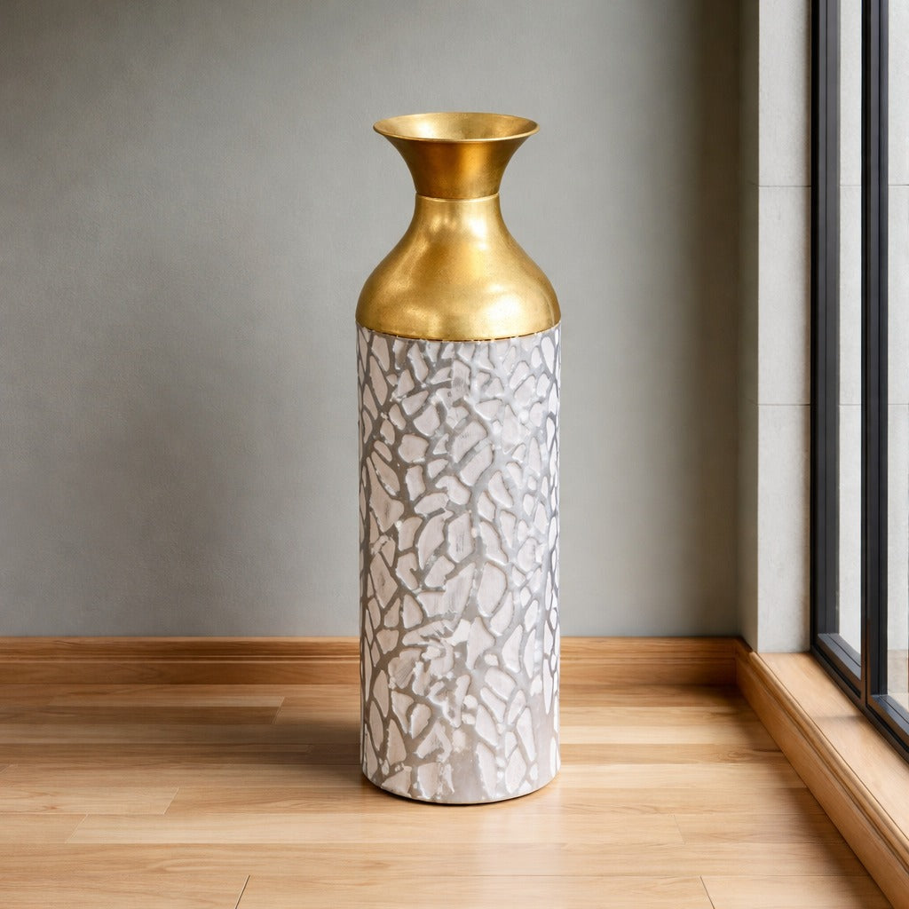 A contemporary tall vase featuring an abstract stone-pattern finish in muted greys, accented with a brushed gold top for contrast and refinement.