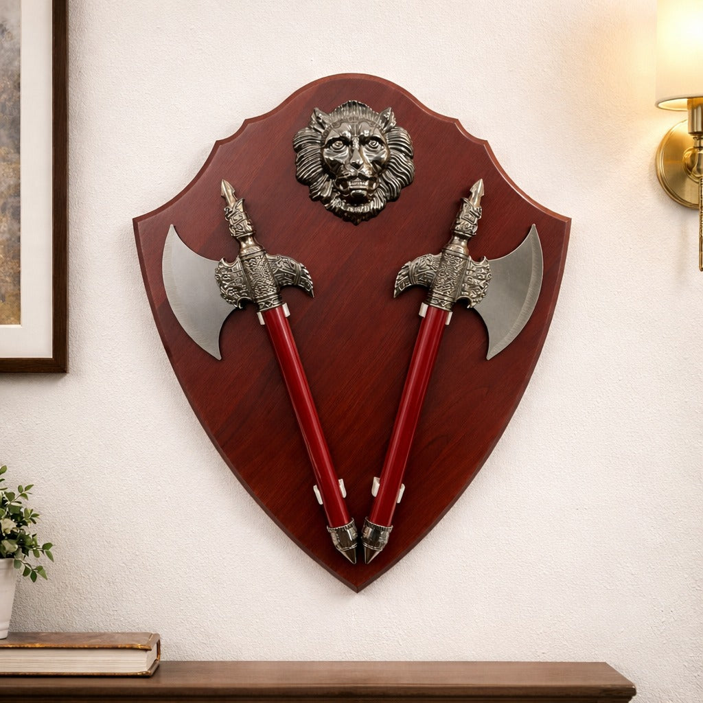 A bold wall-mounted decorative plaque featuring a sculpted lion head centerpiece with crossed axe detailing on a polished wooden shield base. Symbolic, powerful, and statement-making.